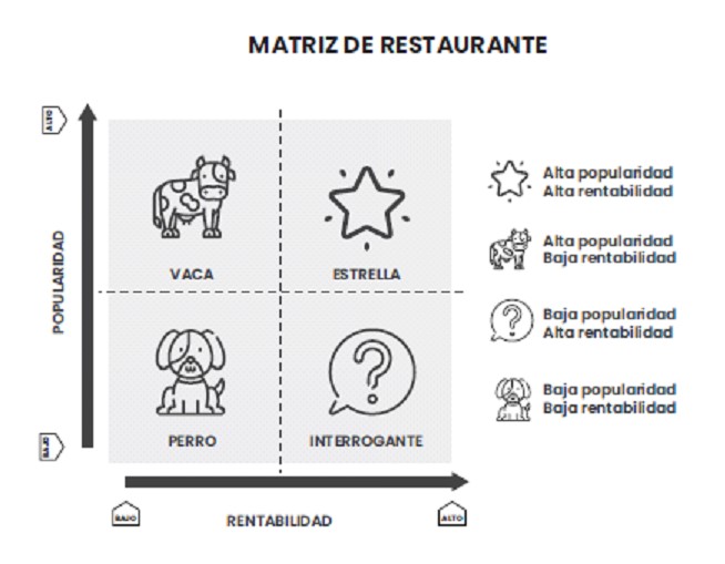 Con estos datos puedes categorizar cada uno los ítems de tu menú y encontrar oportunidades de mejora. Para hacerlo corto, estas categorías nacen de la matriz del Boston Consulting Group que se adecuan a un escenario gastronómico para relacionar la rentabilidad de tus productos como su popularidad.
